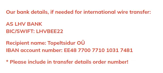 It is crucial that all details from the invoice are entered correctly, especially the bank account number. Mistakes in these details may prevent your payment from reaching us. If the payment is not received, your order will remain marked as “not paid”, and our team will not process it, delaying or preventing delivery of your products.